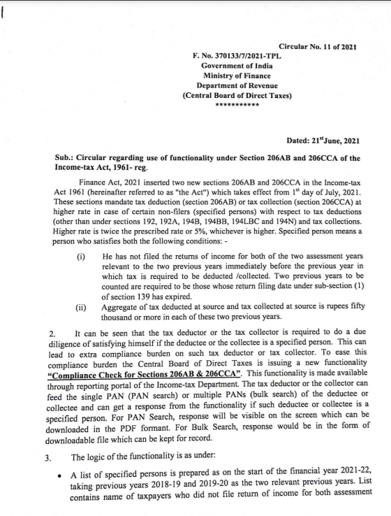 CBDT issued Circular No. 11 of 2021 dated 21st June 2021 regarding use of functionality under section 206AB and 206CCA of the Income-tax Act, 1961. Posted on 22nd Jun 202122nd Jun 2021 by Business So Simple in Income Tax Extract of copy of Circular No. 11 of 2021 dated 21st June 2021 : Share this: Click to share on X (Opens in new window) X Click to share on Facebook (Opens in new window) Facebook Like Loading... Related Published by Business So Simple Hi, I am business consultant working with a team of Chartered Accountants, Company Secretaries, Lawyers & MBAs. View all posts by Business So Simple