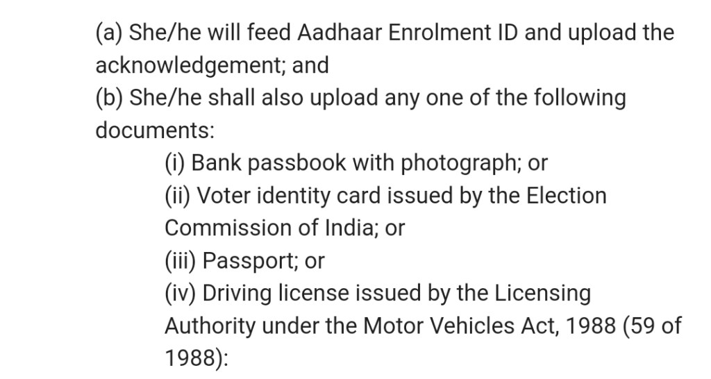 If Aadhaar number has not been assigned to the concern person for Aadhaar authentication as specified above, such person may undergo e-KYC verification by furnishing the following: