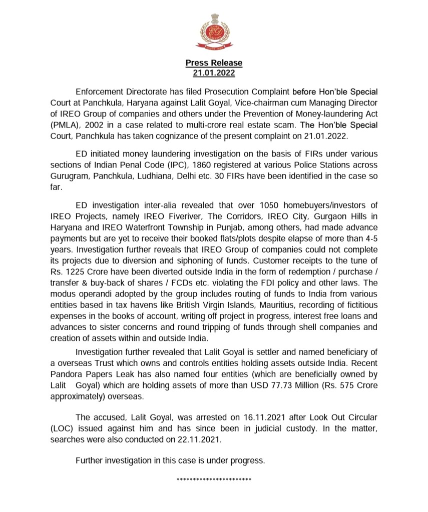 ED has filed Prosecution Complaint against Lalit Goyal, Vice-chairman cum Managing Director of IREO Group and others under PMLA, 2002 in a case related to multi-crore real estate scam. Hon’ble Special Court, Panchkula has taken cognizance of the present complaint on 21.01.2022.