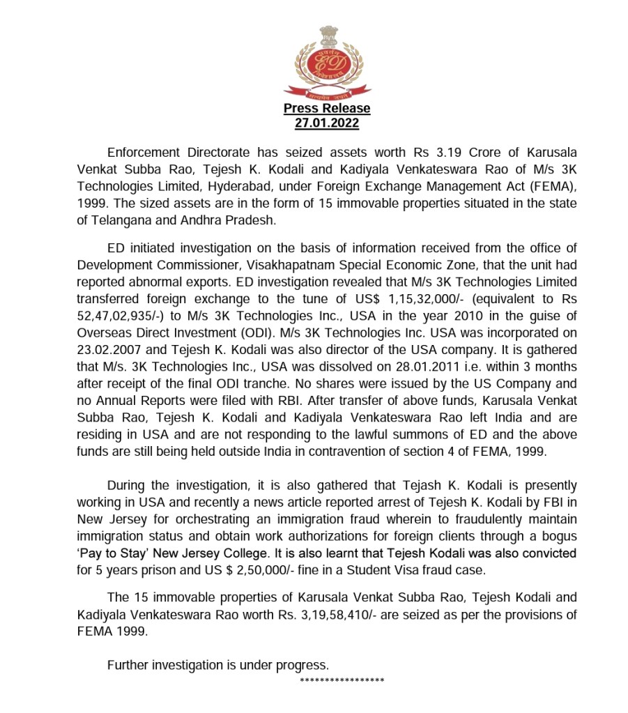 ED has seized assets worth Rs 3.19 Crore of Karusala Venkat Subba Rao, Tejesh K. Kodali and Kadiyala Venkateswara Rao of M/s 3K Technologies Limited, Hyderabad, under FEMA, 1999.
