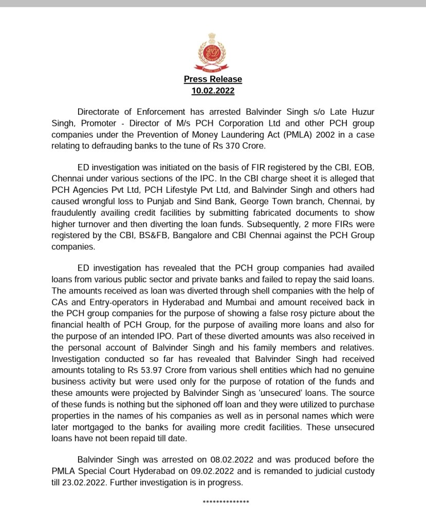 ED has arrested Balvinder Singh s/o Late Huzur Singh, Promoter – Director of M/s PCH Corporation Ltd and other PCH group companies under PMLA, 2002 in a case relating to defrauding banks to the tune of Rs 370 Crore (Press release 10 Feb 2022)