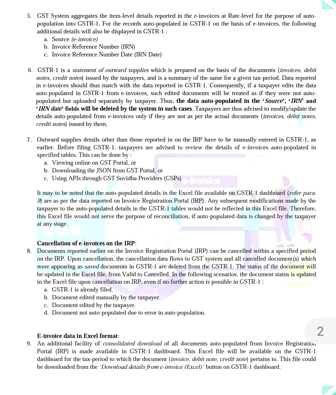 - For a detailed advisory regarding auto-population of e-invoice data into GSTR-1 tables, please refer below: