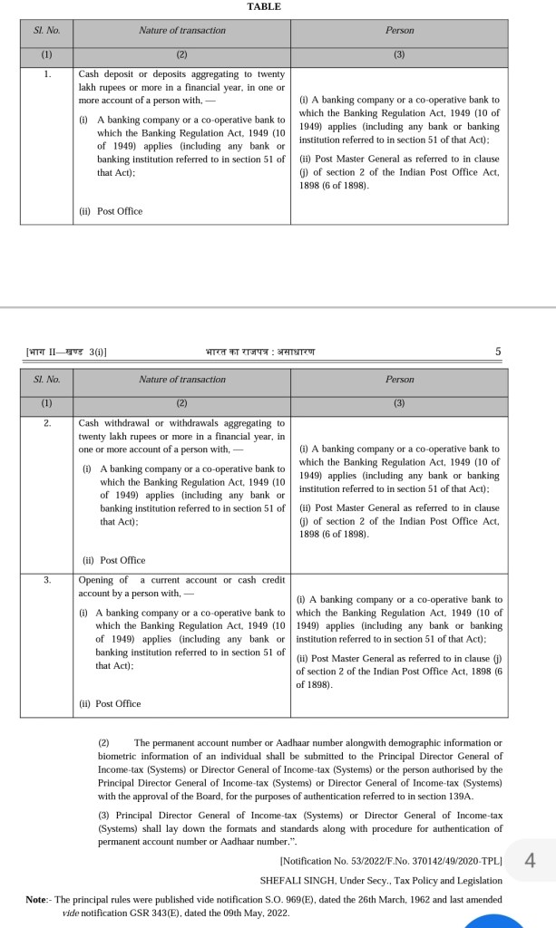 “114BB. Transactions for the purposes of sub-section (6A) of section 139A and prescribed person for the purposes of clause (ab) of Explanation to section 139A.–– (1) Every person shall, at the time of entering into a transaction specified in column (2) of the Table below, quote his permanent account number or Aadhaar number, as the case may be, in documents pertaining to such transaction, and every person specified in column (3) of the said Table, who receives such document, shall ensure that the said number has been duly quoted and authenticated—