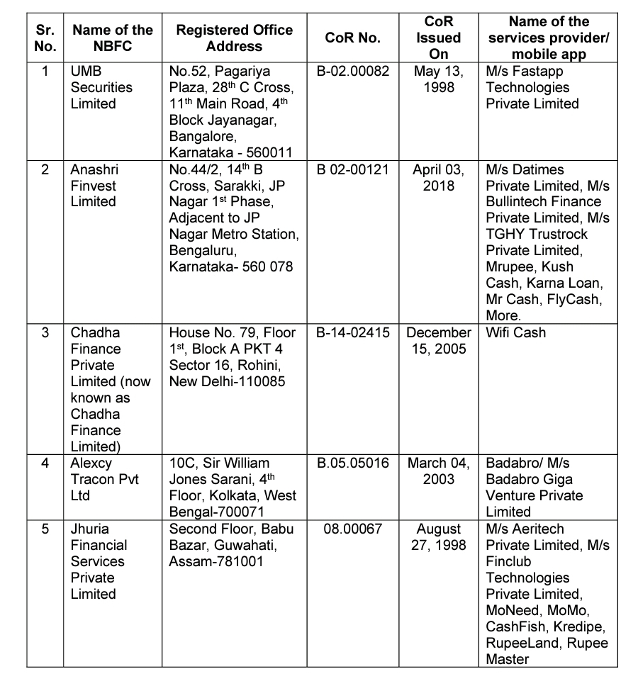 The CoR of the abovementioned NBFCs have been cancelled on account of violation of RBI guidelines on outsourcing and Fair Practices Code in their digital lending operations undertaken through third party apps which was considered detrimental to public interest. These companies were also not complying with the extant regulations pertaining to charging of excessive interest and had resorted to undue harassment of customers for loan recovery purposes.