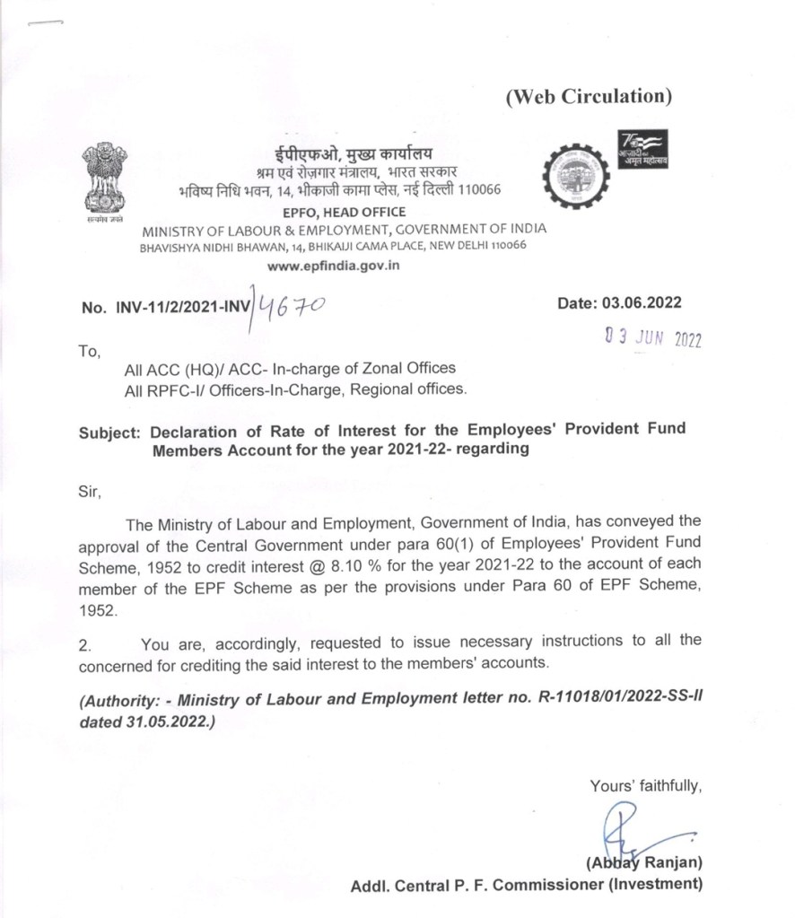 EPF interest rate for the FY 2021-22 : 8.10 % (EPF Notification dated 03 June 2022) Posted on 9th Jun 2022 by Business So Simple in Financial Prudence Share this: Click to share on X (Opens in new window) X Click to share on Facebook (Opens in new window) Facebook Like Loading... Related Published by Business So Simple Hi, I am business consultant working with a team of Chartered Accountants, Company Secretaries, Lawyers & MBAs. View all posts by Business So Simple