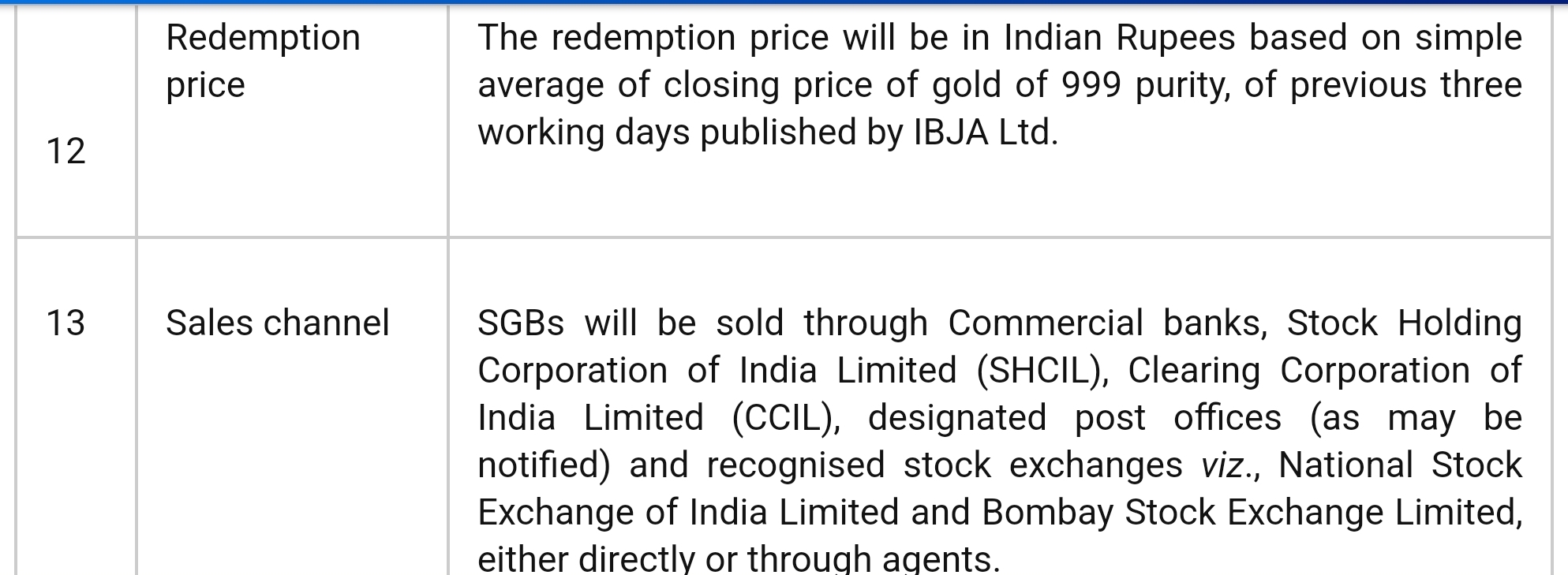 The Sovereign Gold Bonds (SGBs) will be sold through Scheduled Commercial banks(except Small Finance Banks and Payment Banks), Stock Holding Corporation of India Limited (SHCIL),Clearing Corporation of India Limited (CCIL), designated post offices, and recognised stock exchanges viz., National Stock Exchange of India Limited and Bombay Stock Exchange Limited.The features of the Bond are as under: