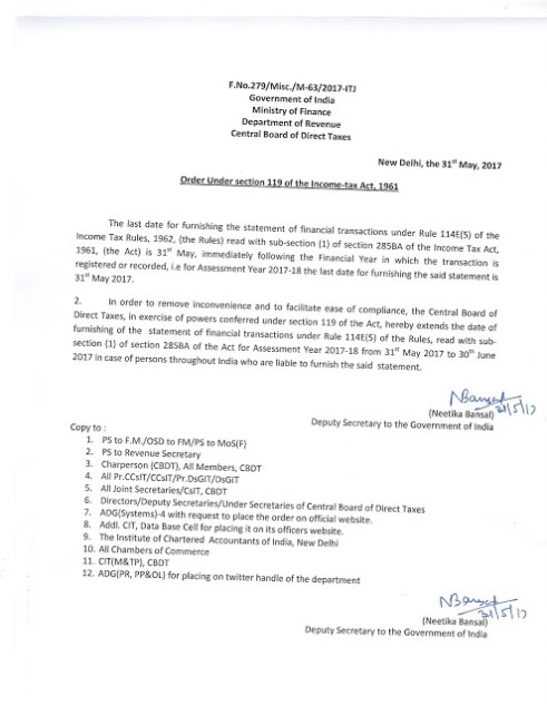 CBDT Issues Clarification on furnishing SFT, due date of furnishing SFT extended to 30 June 2017