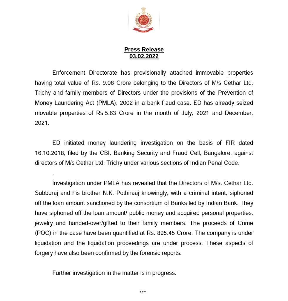ED has arrested Balvinder Singh s/o Late Huzur Singh, Promoter – Director of M/s PCH Corporation Ltd and other PCH group companies under PMLA, 2002 in a case relating to defrauding banks to the tune of Rs 370 Crore (Press release 10 Feb 2022)